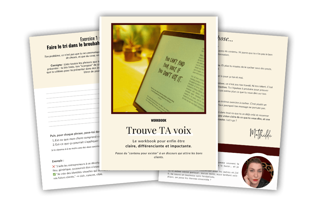 C’est exactement pour ça que ce workbook existe : pour t’aider à clarifier ton discours, arrêter de bricoler et poser les fondations d’une communication qui attire, enfin,les bons clients.